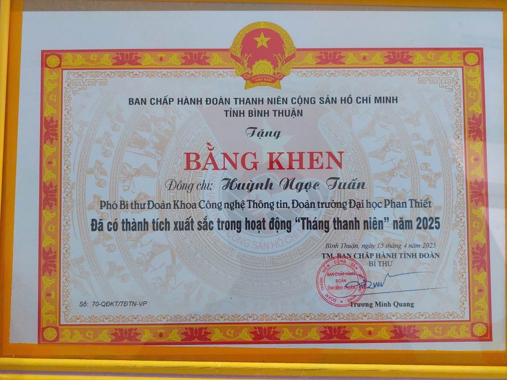 Đồng chí Huỳnh Ngọc Tuấn – Phó Bí thư Đoàn khoa CNTT nhận Bằng khen cá nhân đã có thành tích xuất sắc trong hoạt động Tháng Thanh niên năm 2025.
