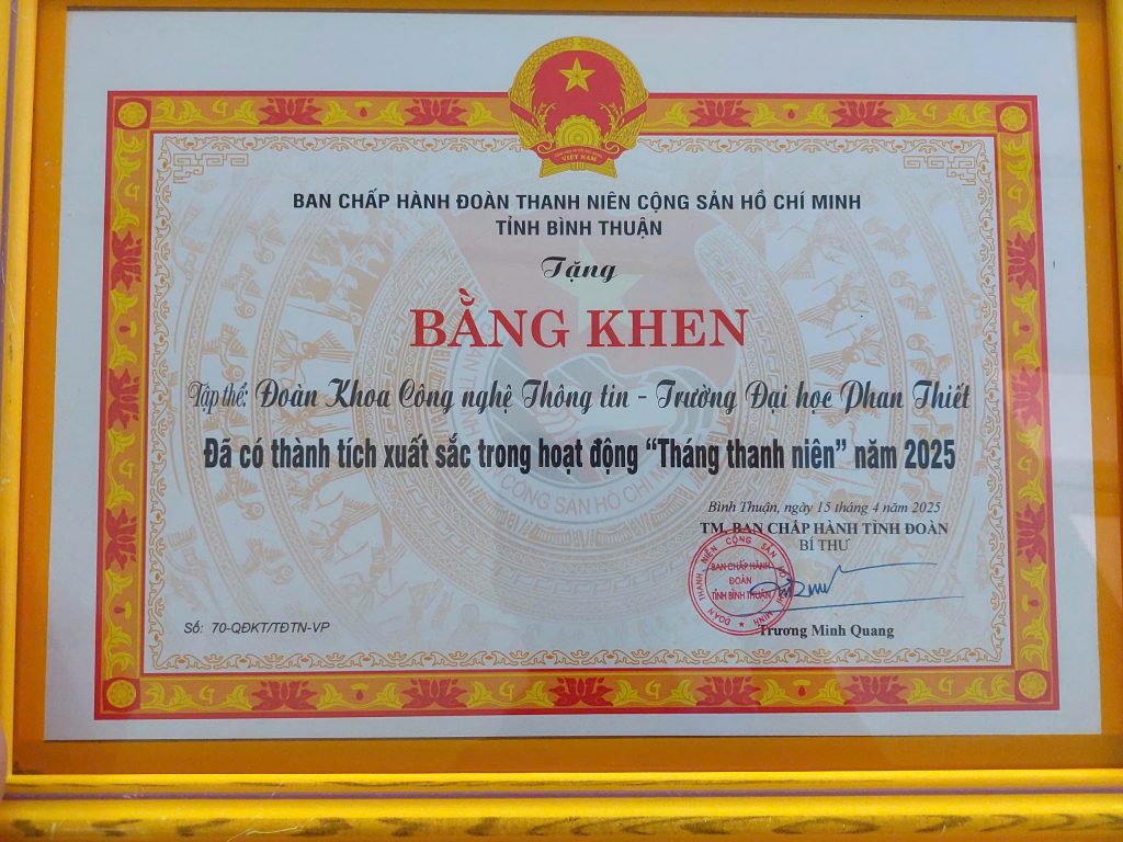 Trong dịp này, Đoàn Thanh niên khoa Công nghệ Thông tin – Trường Đại học Phan Thiết vinh dự được trao Bằng khen của Ban Thường vụ Tỉnh đoàn.