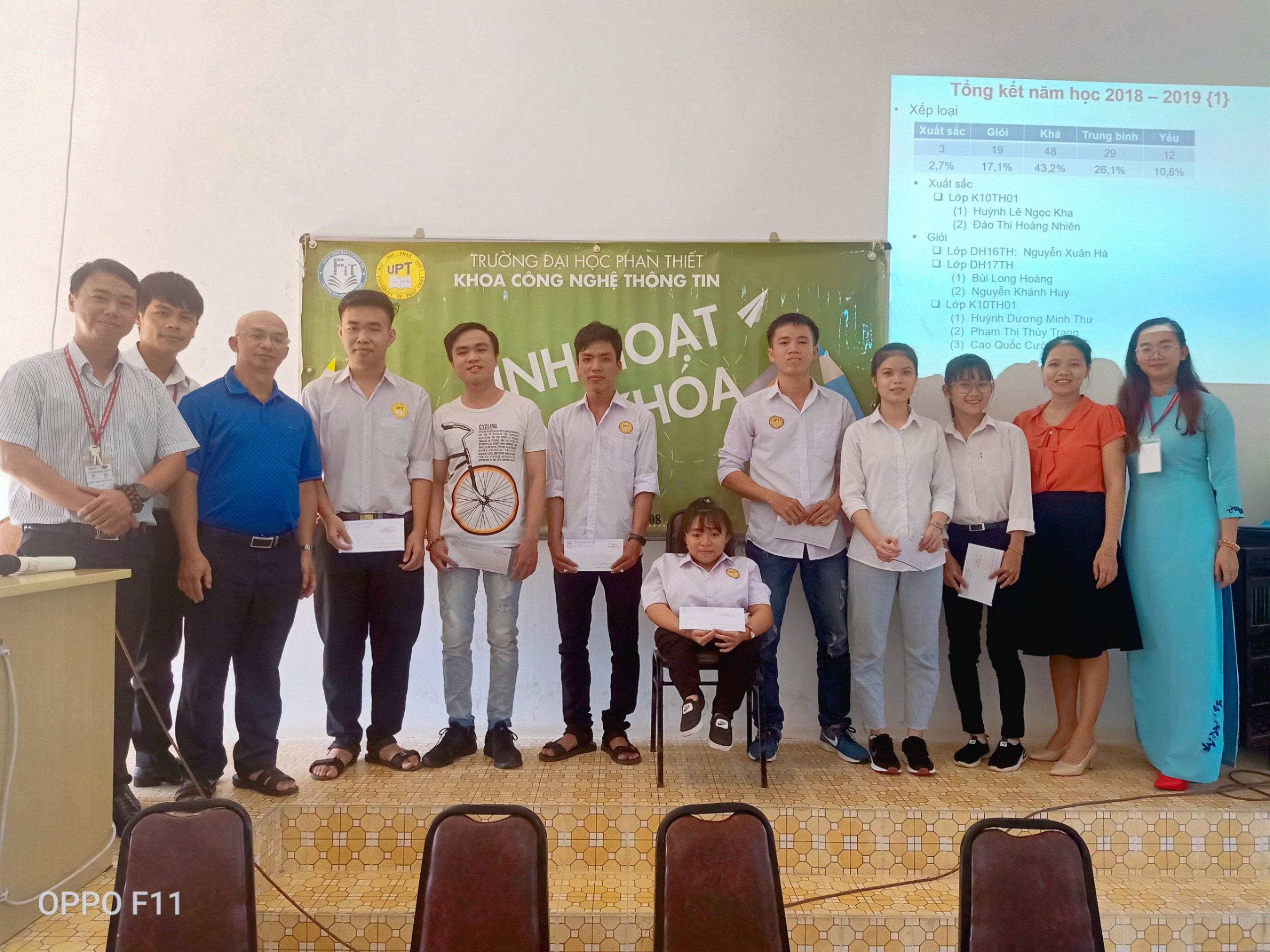Thứ nhất, Tổng kết kết quả học tập của năm học 2018 – 2019, Tuyên dương các sinh viên có thành tích xuất sắc trong học tập và thi đua đồng thời để động viên, khuyến khích tinh thần cố gắng học tập, Khoa đã trao các món quà cho những bạn đạt thành tích sinh viên Xuất sắc và sinh viên Giỏi. Bên cạnh đó cũng nhắc nhở các bạn sinh viên yếu kém, vạch ra kế hoạch giúp các bạn vươn lên trong học tập cũng như rèn luyện.