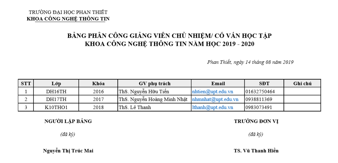 Thứ hai, Công bố danh sách phân công GVCN/CVHT phụ trách các lớp để sinh viên có thể chủ động liên hệ, trao đổi các phương pháp học tập cũng như các kiến thức liên quan.