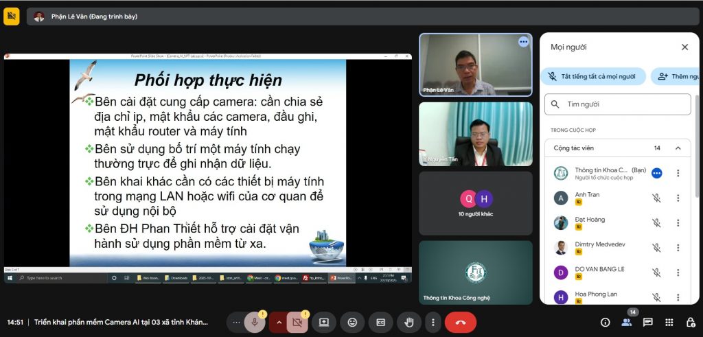 Nhằm đẩy mạnh ứng dụng công nghệ trong công tác đảm bảo an ninh trật tự, chiều ngày 22/10/2025, Khoa Công nghệ Thông tin trường Đại học Phan Thiết đã tổ chức buổi họp trực tuyến thảo luận dự án lắp đặt hệ thống camera giám sát an ninh tại 3 xã tỉnh Khánh Hòa: Phước Dinh – Vĩnh Hải – Xuân Hải.
