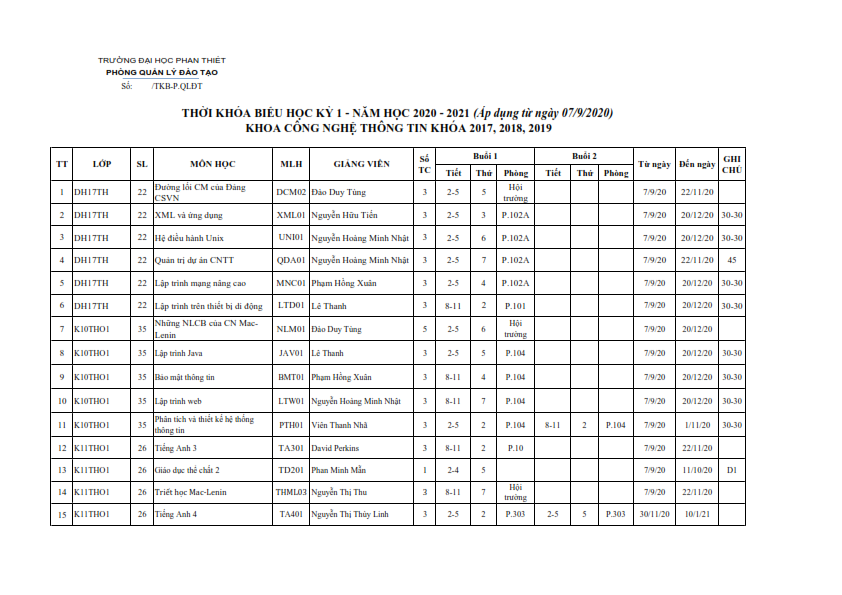 Khoa Công nghệ thông tin Thông báo sinh viên Thời Khóa Biểu HKI năm học 2020 – 2021 (đính kèm)