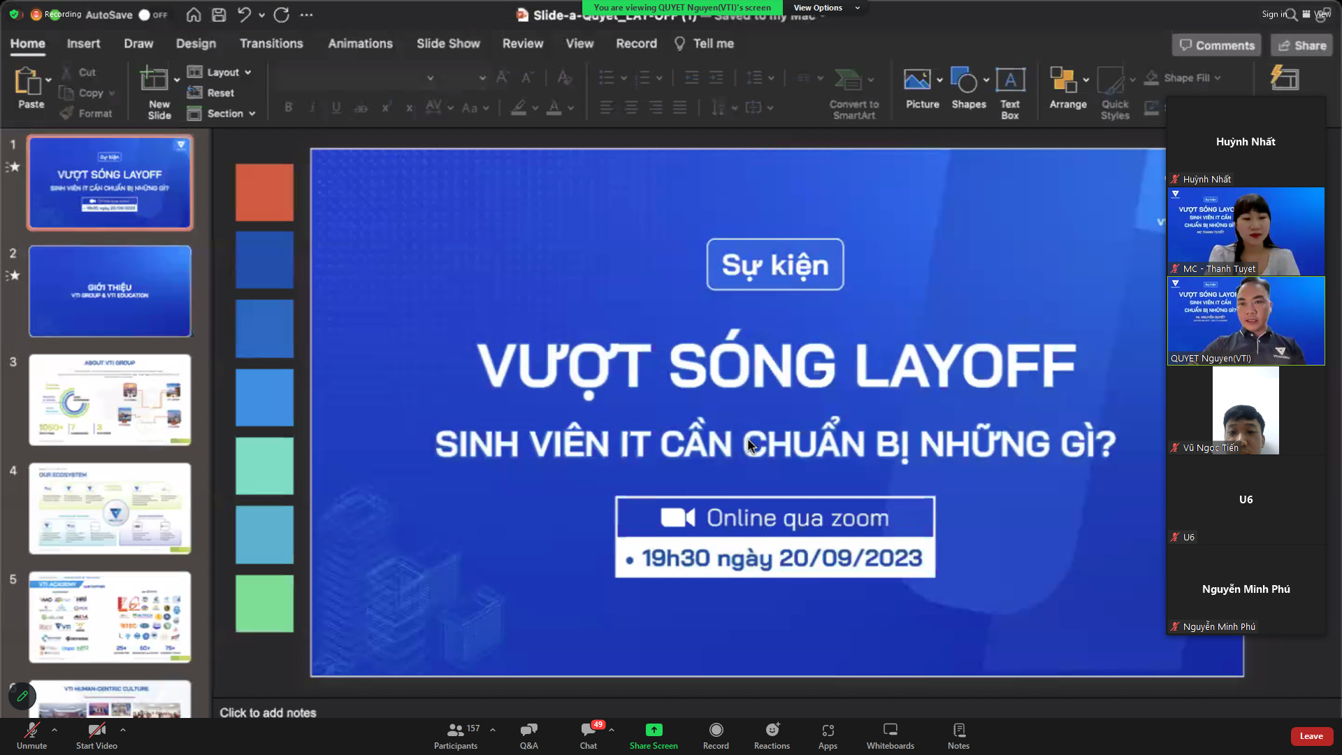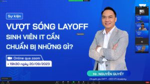 Vào lúc 19h30 tối ngày 20.9.2023, sinh viên khoa Công nghệ thông tin đã tham gia sự kiện “VƯỢT SÓNG LAYOFF – SINH VIÊN IT CẦN CHUẨN BỊ NHỮNG GÌ?’ do VTI Academy tổ chức.